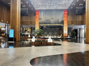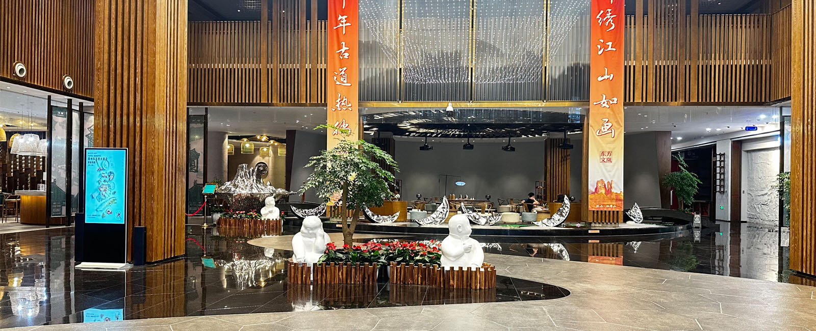 饭店坐落于江山市双塔街道锦绣大道2幢,距江山高铁站1.5KM(高铁站免费接送),交通便利,拥有停车位1500个,总建筑面积5万多平方米,设有客房408间(套),床位645个,个性鲜明,别具特色。风格迥异的观景特色包厢12个,餐饮餐位3000余个,配有大小会议室10余间,其中层高17.5米的东方大会堂可同时容纳1500余人,是集住宿、餐饮、休闲、娱乐为一体的大型特色文化主题饭店。